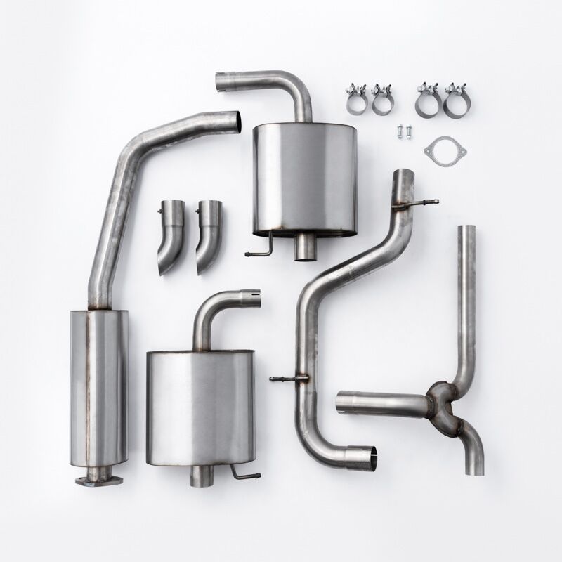 Utförande: 2½” till förgrening vid bakaxel. Därefter 2″ till ljuddämpare. Dolda neråt bockade ändrör ingår.